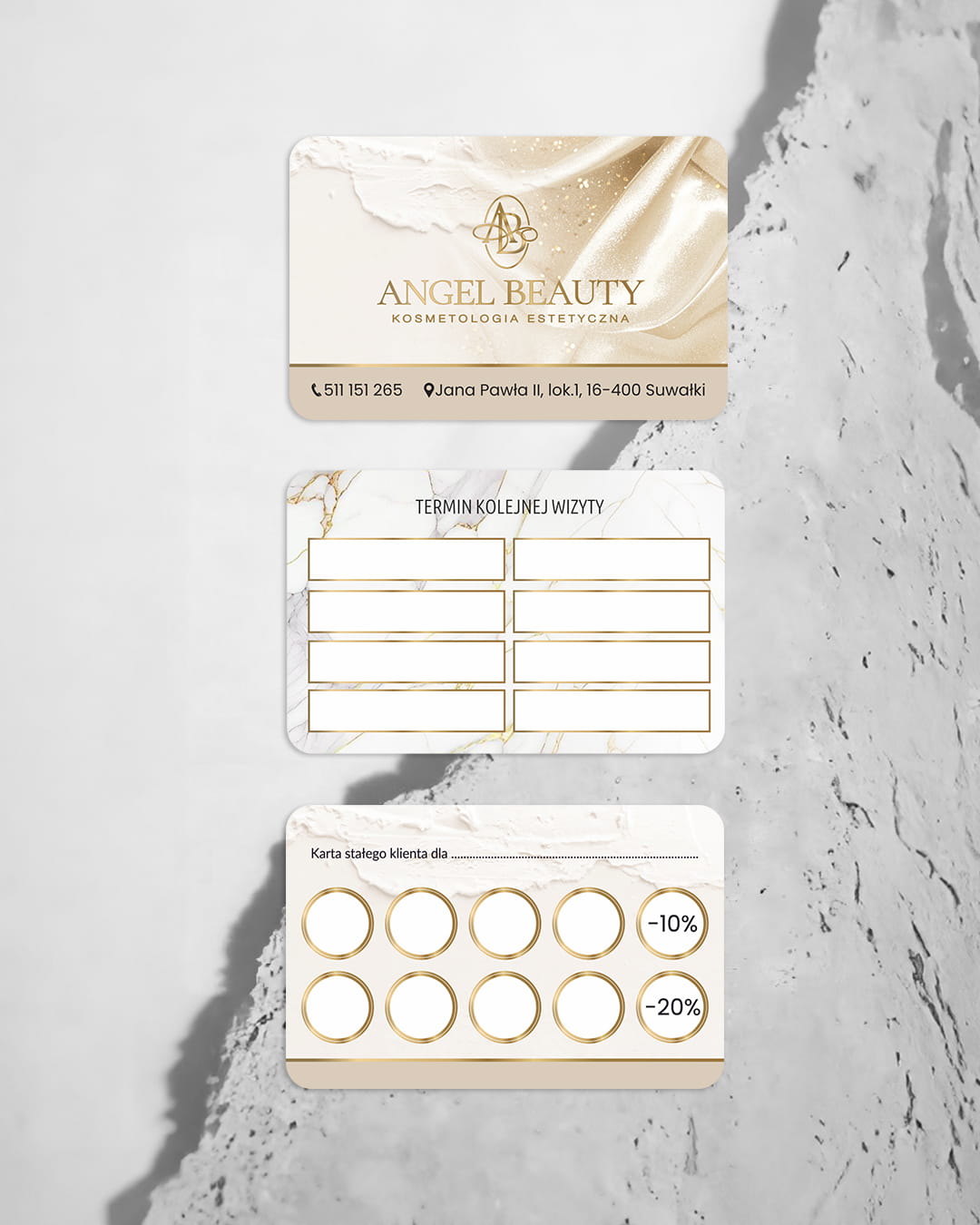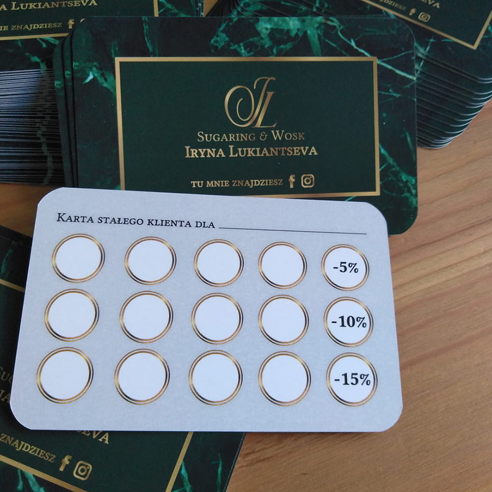 Karty biznesowe na kartonie premium 350 g/m2. Świetnie spełniają funkcję kart rabatowych, terminarzy itd.